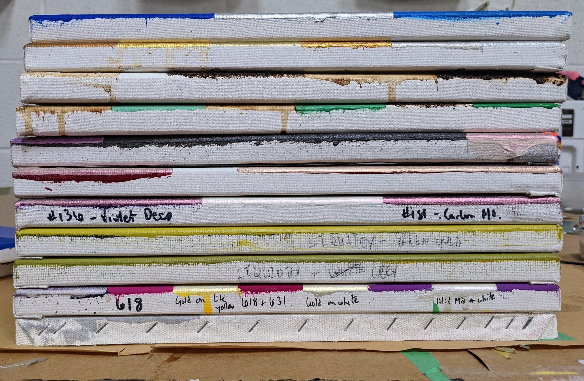 Test paintings are small 9" x 12" stretched canvases that I use to test paint, colour combinations and finishes before I commit them to an artwork. Some are visually satisfying, some aren't, some are rough, some are neat and some are just interesting. Yet all tell a little story about my work and painting process.